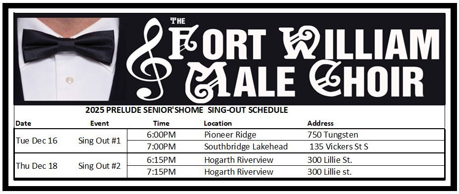 In keeping with our longstanding tradition of community service, the Choir will also share a special portion of our performance with residents in long-term care who may not be able to attend. Details for these "sing-outs" are available below. For 98 years, the Fort William Male Choir has been committed to giving back to the community that has supported them. If you're interested in joining the Choir, please contact us today.